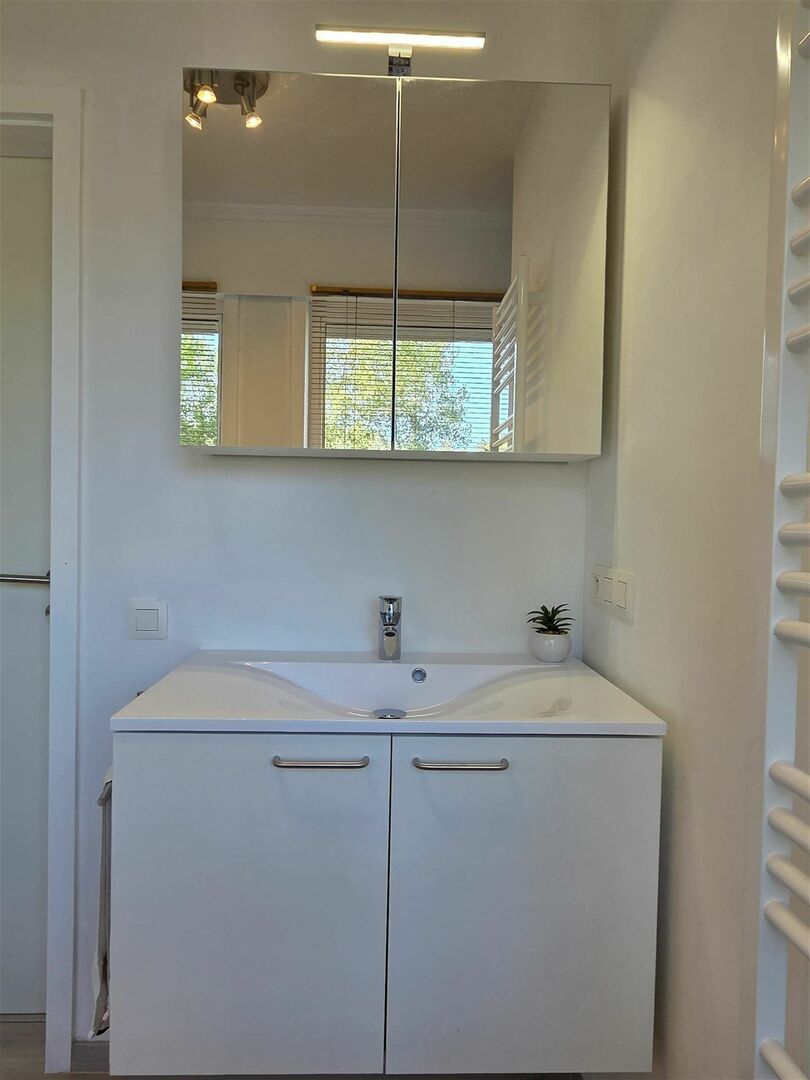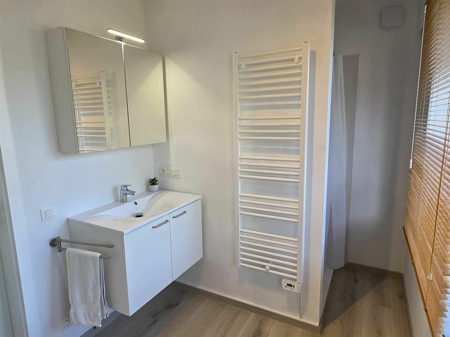 Inkomhal / wc / living met eetplaats en ingerichte open keuken (totale opp.: 25m²) ) met toegang tot groot zuid-georiënteerd terras (19m²) / wc met handwas / berging met was- en stookplaats / slaapkamer (3,9 x 2,8m) / badkamer (7m²) met wastafel, douche en wc.