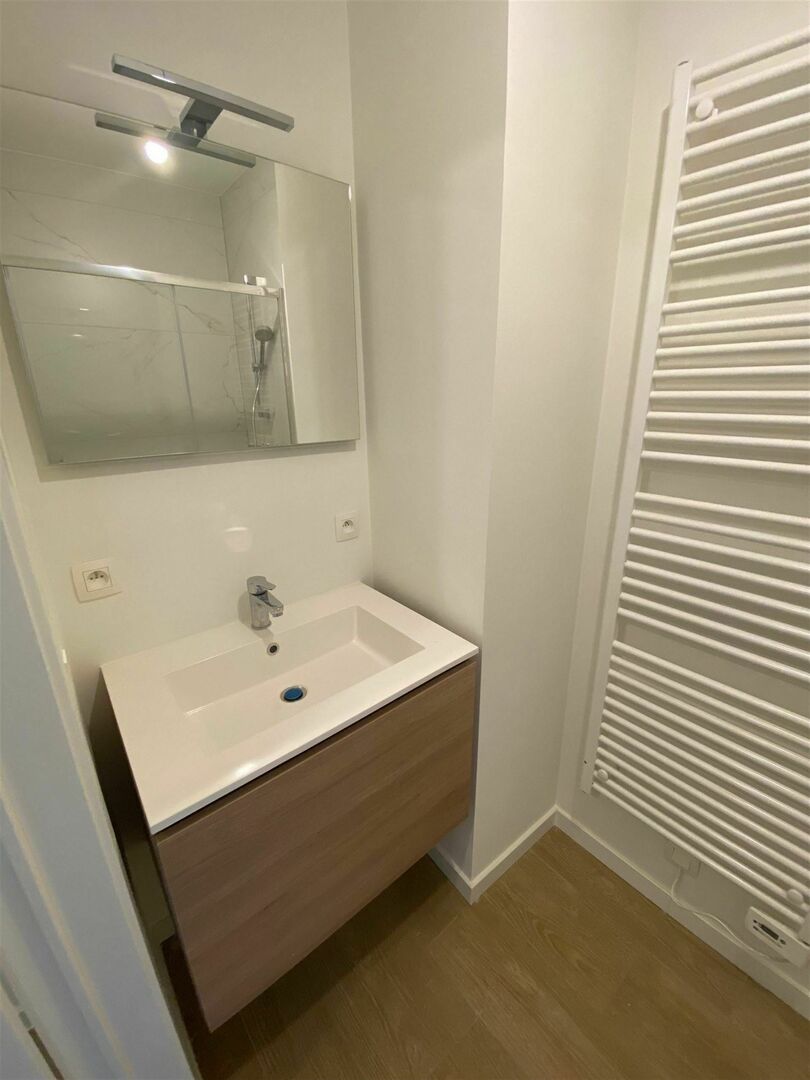 Inkomhal met vestiaire / wc met handwas / living met eetplaats en super-ingerichte open keuken (totale opp.: 30m²) / berging met was- en stookplaats / slaapkamer (10m²) met inmaakkast / badkamer met wastafel en douche.
