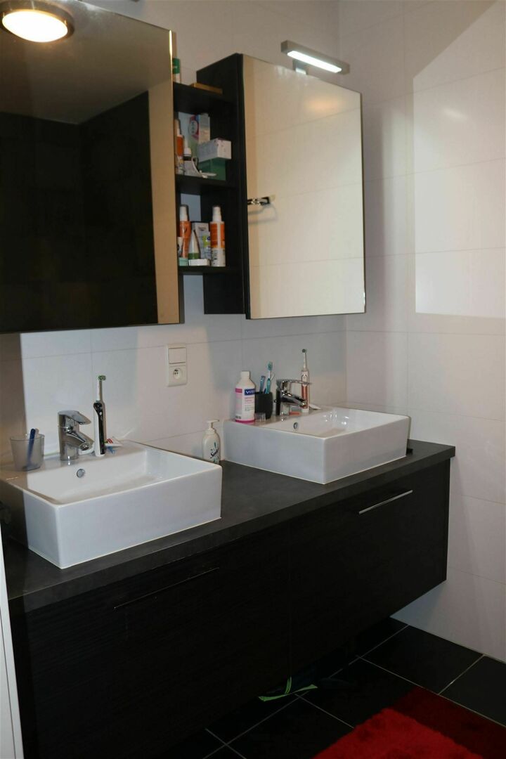 Inkomhal met vestiaire / wc met handwas / living met eetplaats (38m²) met super-ingerichte open keuken (8m²) en toegang tot terras (4,1 x 1,7m) / berging / nachthal / wc / 2 slaapkamers (4 x 3,6m; 3,6 x 3m) waarvan de grootste met toegang tot terras (7m²) en gemeenschappelijke tuin / badkamer (2,7 x 1,8m) met dubbele wastafel en ligbad / douchekamer (2,7 x 0,9m) met wasplaats.