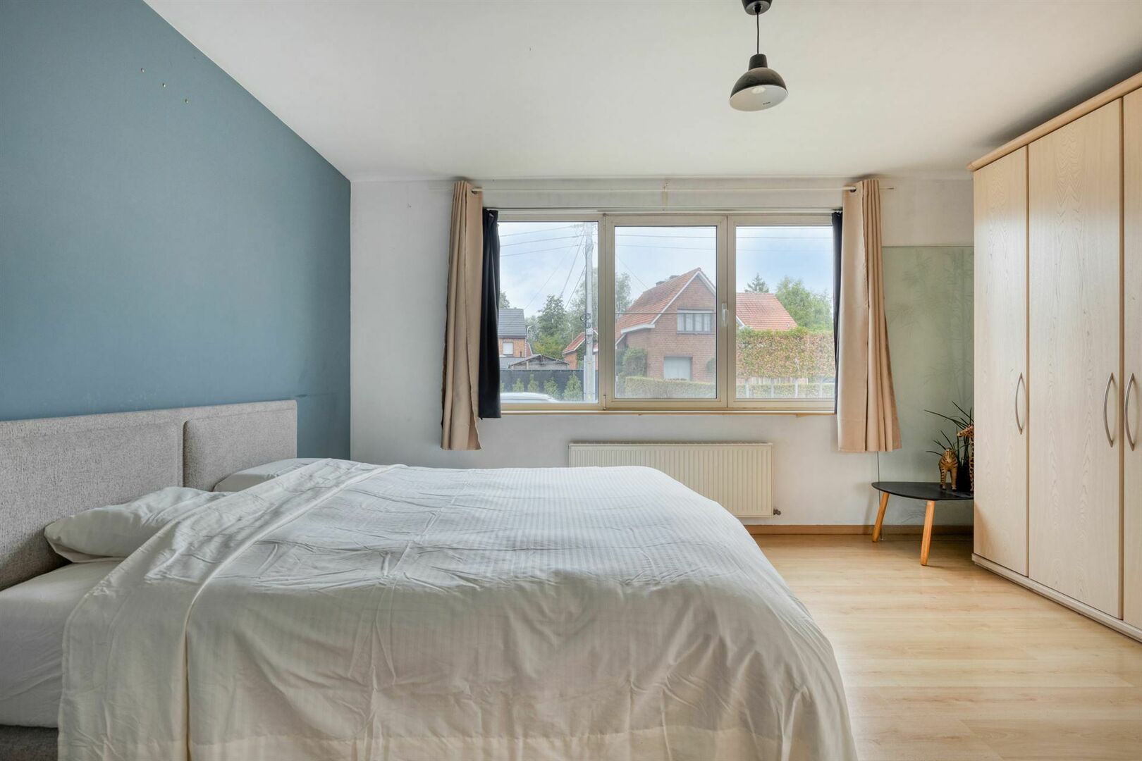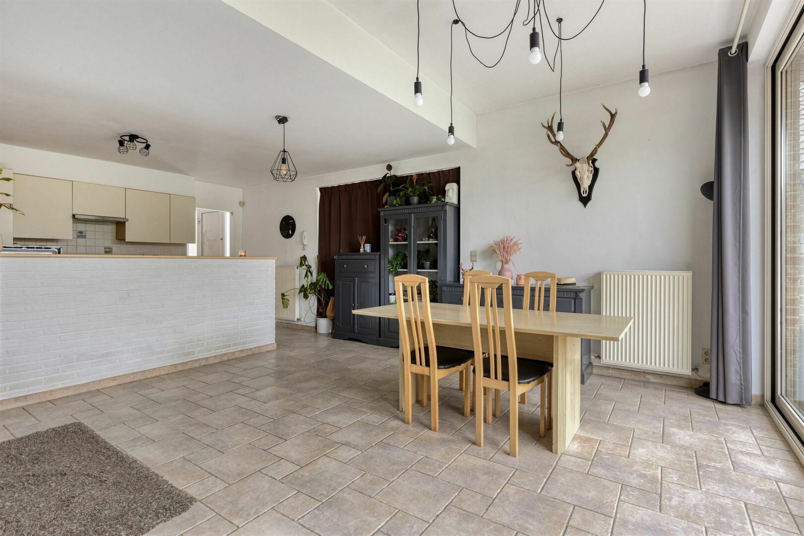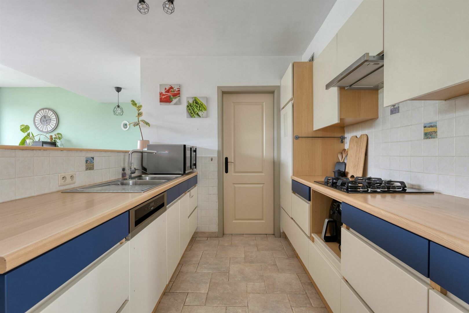 Inkomhal met vestiaire / wc met handwas / aangename living met eetplaats en salon met zicht op tuin en prima uitgeruste, open keuken met gasvuur en vaatwasser (41m²) / berging - wasplaats / ruime slaapkamer (4,6 x 4m) met inbouwkast / badkamer met wastafel en douche.