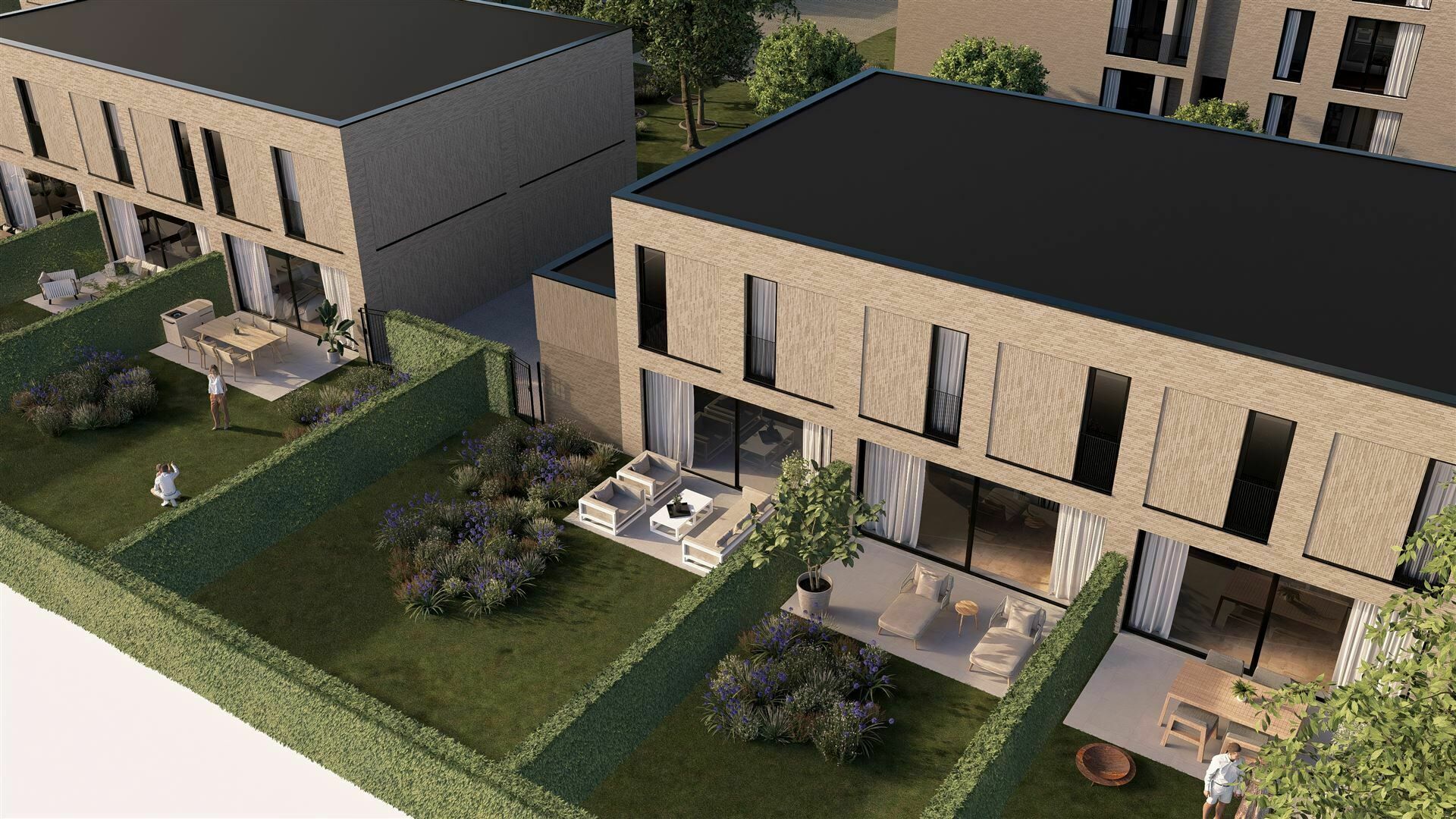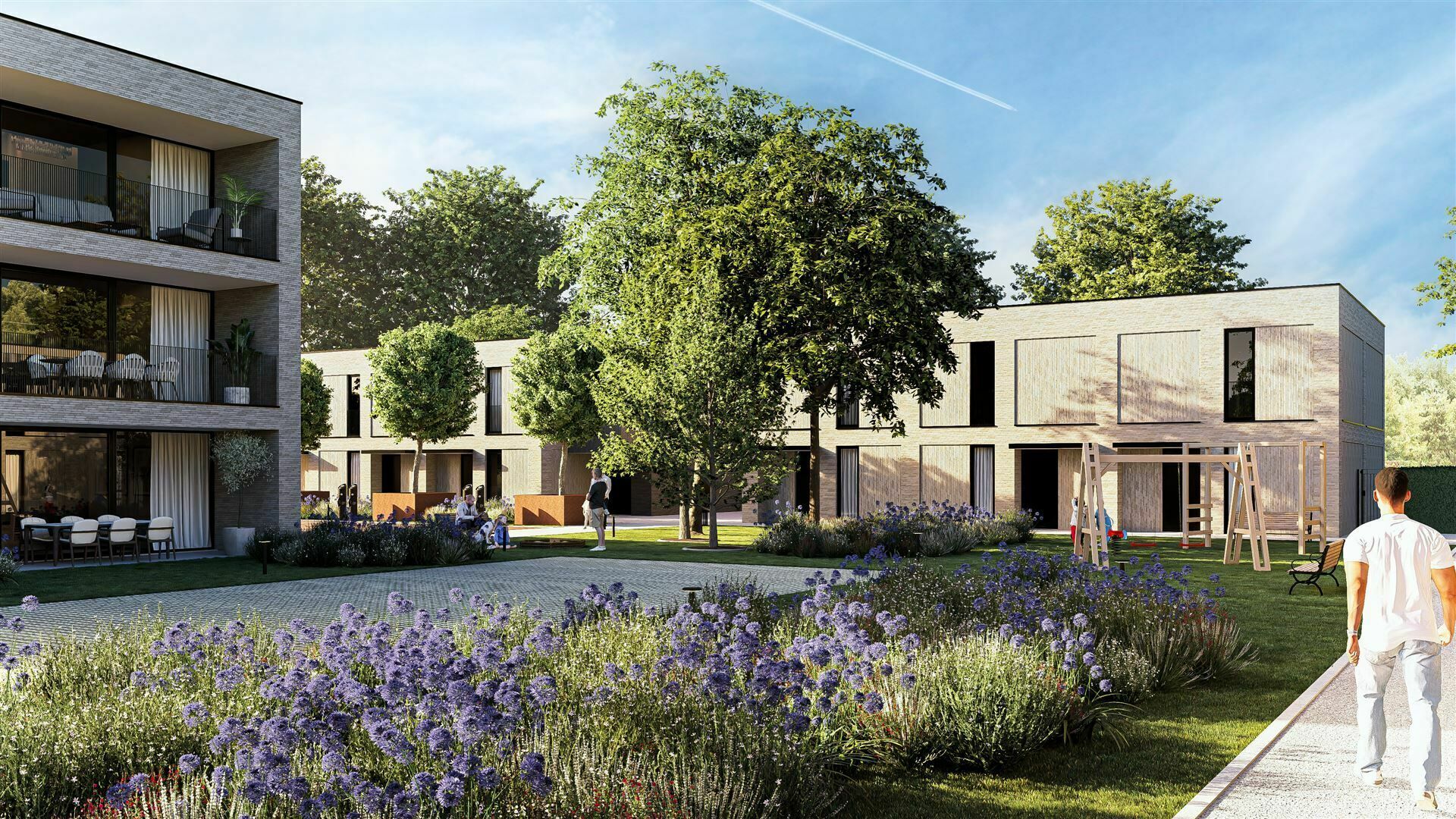 De ondergrondse parkeerplaatsen voor je wagen en fietsen, zorgen voor een autovrij woonerf, waar bewoners in alle rust kunnen vertoeven.