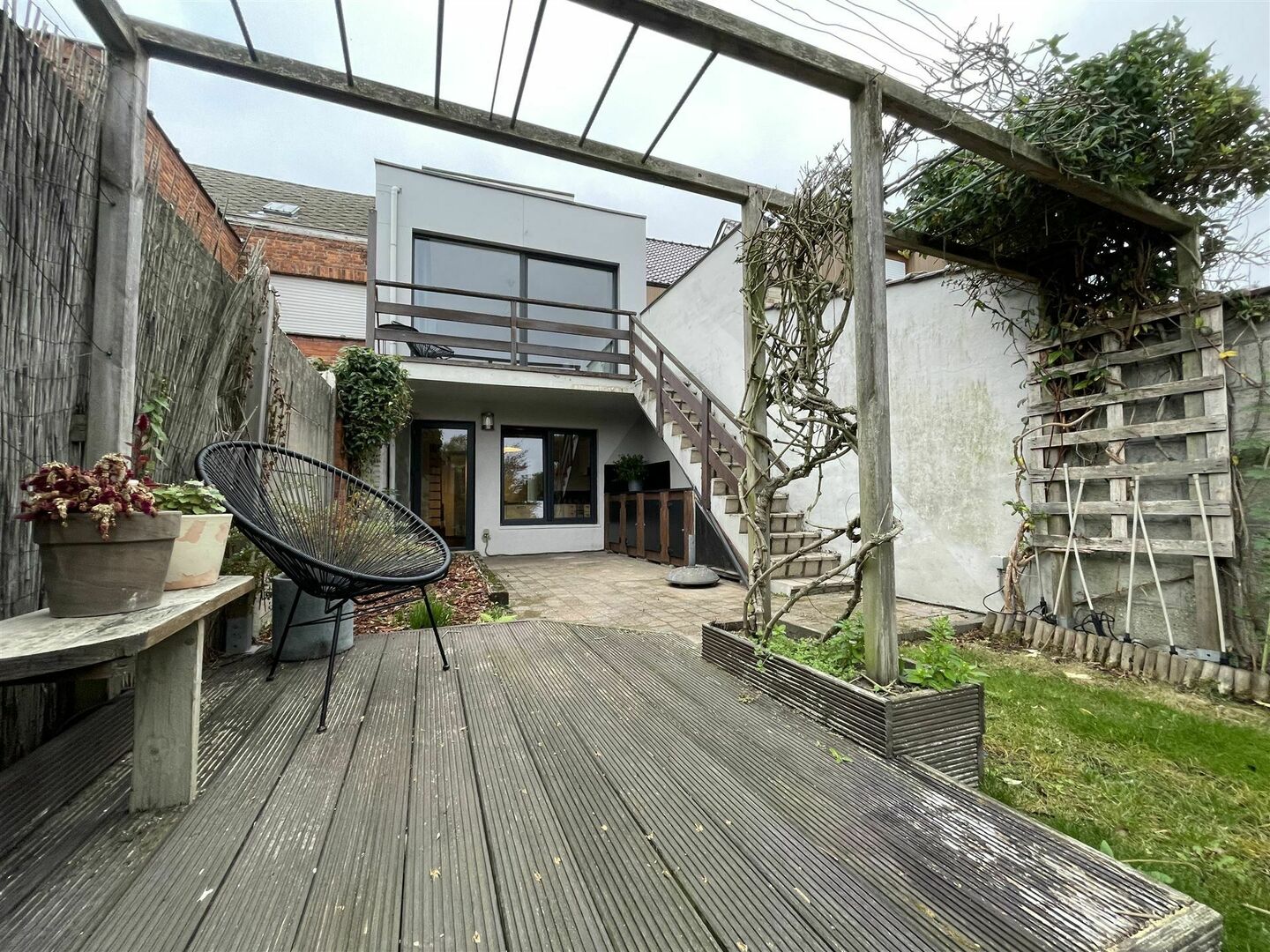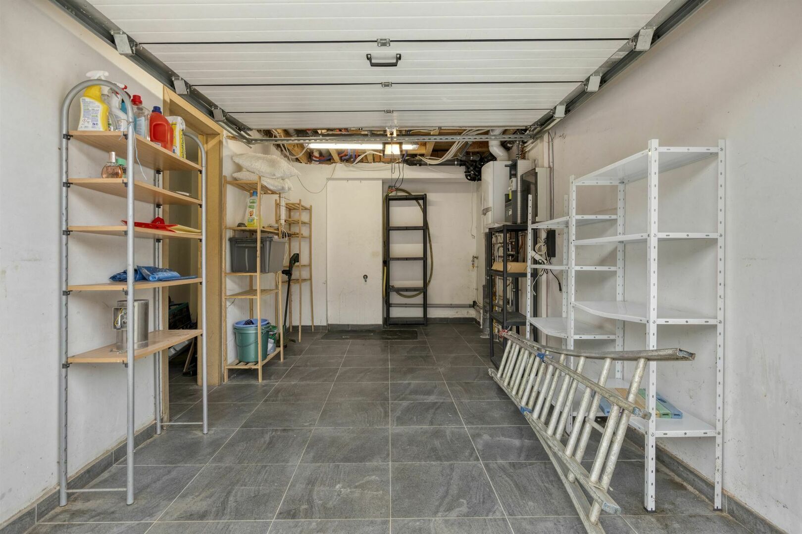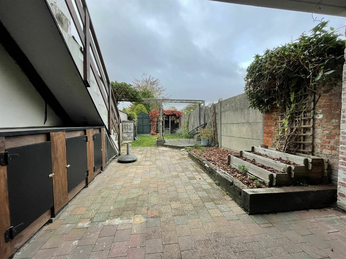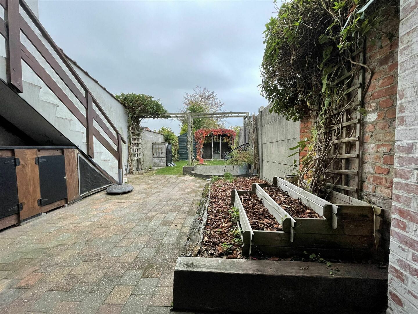 Gelijkvloers: inkomhal / garage (4,71m x 2,78m) / wc / volledig uitgeruste leefkeuken (5,5m x 4m) die aansluit op het gelijkvloers terras (18,4m²) / aangelegde tuin (west-gericht) met tuinhuis en zonneterras.
