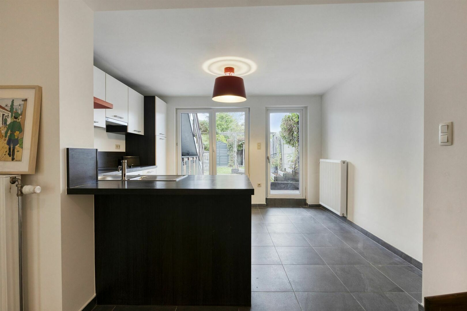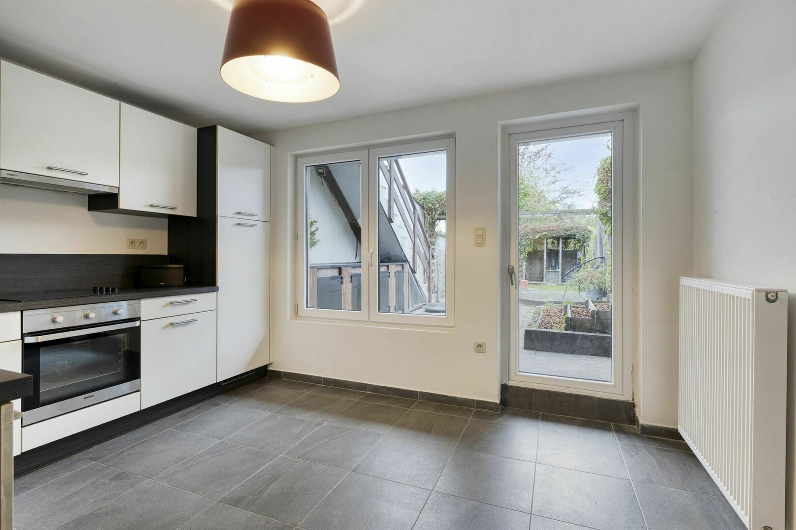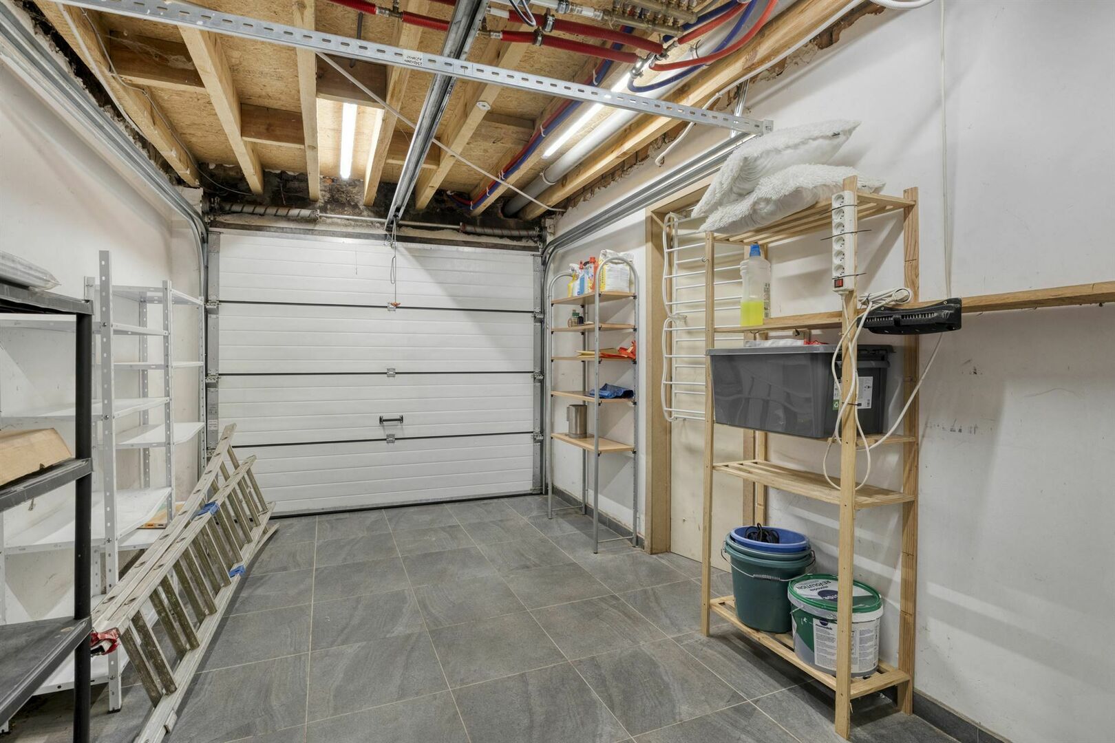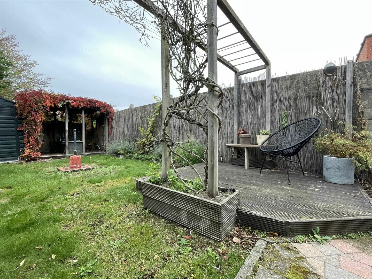 Gelijkvloers: inkomhal / garage (4,71m x 2,78m) / wc / volledig uitgeruste leefkeuken (5,5m x 4m) die aansluit op het gelijkvloers terras (18,4m²) / aangelegde tuin (west-gericht) met tuinhuis en zonneterras.