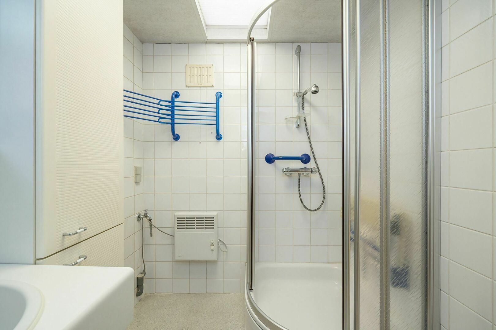 Gelijkvloers.: Inkomhal / gezellige leefruimte met eetplaats en salon, vloerbekleding in parket (31 m²) / goed uitgeruste keuken met laden en kasten, gasvuur, oven, ... / badkamer met wastafel en douche.