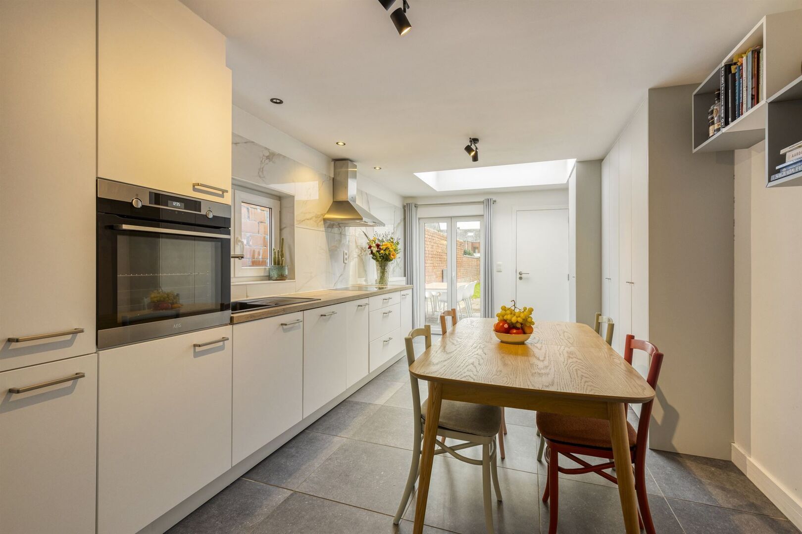 Gelijkvloers: Inkomhal / aangename living met hedendaags design / goed uitgeruste keuken met keramische kookplaat, vaatwasser, oven, koelkast, ... / moderne badkamer met wastafel en ligbad met douchestang.