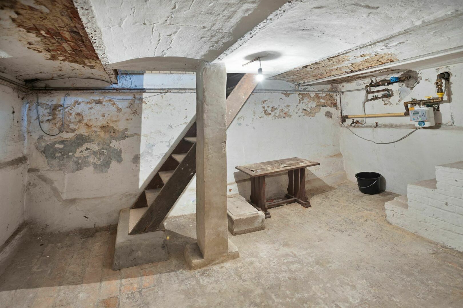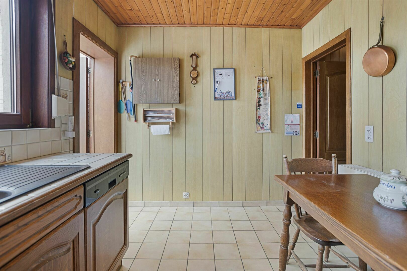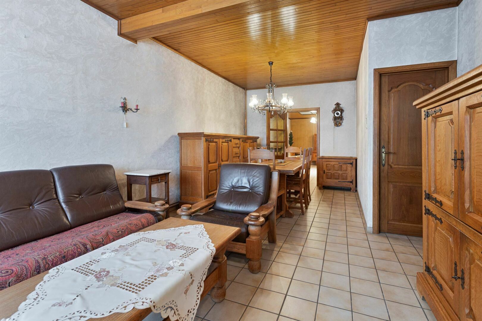 Gelijkvloers : Inkomhal / leefruimte 1 (8 x 4m) (voorheen winkelruimte) / leefruimte 2 (7 x 4m) / keuken met toestellen / te renoveren badkamer met ligbad / wc / veranda (4 x3m) / koer-tuintje (8m²) / stalling (14m²) die ook bereikbaar is langs de achterzijde via een erfdienstbare weg (Ideaal als toegang voor fietsen).